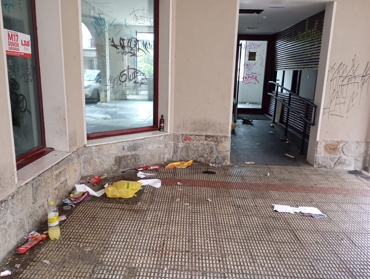 Bizilagunen arabera, "degradazioa eta zikinkeria nabarmenak" dira Grupo San Juango sindikatuen etxeko arkupeetan: "Bihurgune hori dozenaka gazteren ohiko topaleku bihurtu da, edateko, jateko eta porruak erretzeko. Bertan lagatzen duten zabor eta zikinkeria kopuru harrigarriak, pixontzi eta bestelako hondakinekin batera, bizilagunen eta herritarren haserrea piztu du, eta udal garbiketa zerbitzuko langileak ernegatu. Gogaitasuna nabarmena da gaineko bizilagunen artean, marihuana eflubioak jasan behar izaten baitituzte".