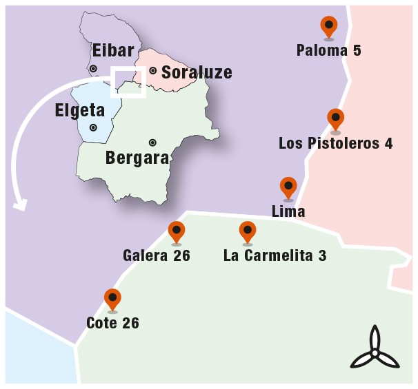 Sei aerosorgailuk osatzen dute parke eolikoaren proiektua, eta horietatik hiru Debagoienean daude kokatuta; Bergaran, zehazki; bi, Eibarren; eta bat, Soraluzen. Bergarako lurretakoak Donejakue –Santiago ermita–, Topinburu eta Aingeru Guarda inguruetako parajeetan joango dira, enpresak aurkeztutako txostenean jasotako mapetan ikus daitekeenez.
