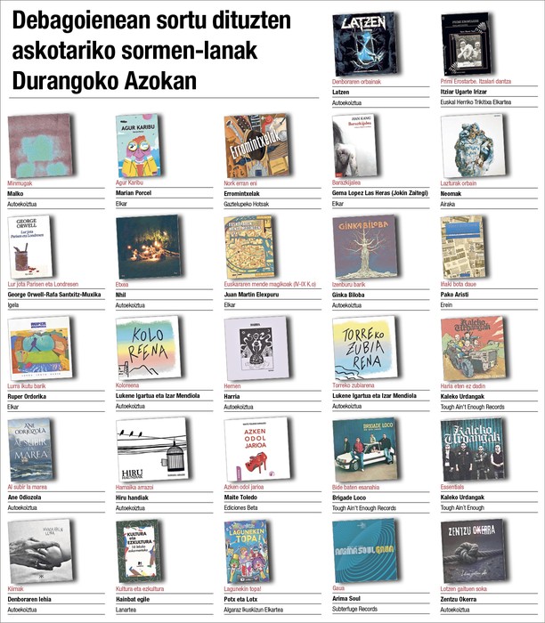 Argitaletxe handien eta txikien stand-etan batzuk, sortzaile ezberdinek elkarrekin jarritako postuetan beste hainbatek, eta euren saltoki propioa duten erakusmahaian beste batzuk izango dute Durangoko Azokara eroandako lanak eskuragarri gaur hasi eta astelehena bitartean Landako gunean kokatutako Kulturaren plazan.