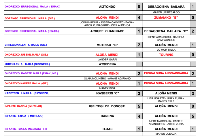 Futbol taldeek asteburuan lortutako emaitzen taula: