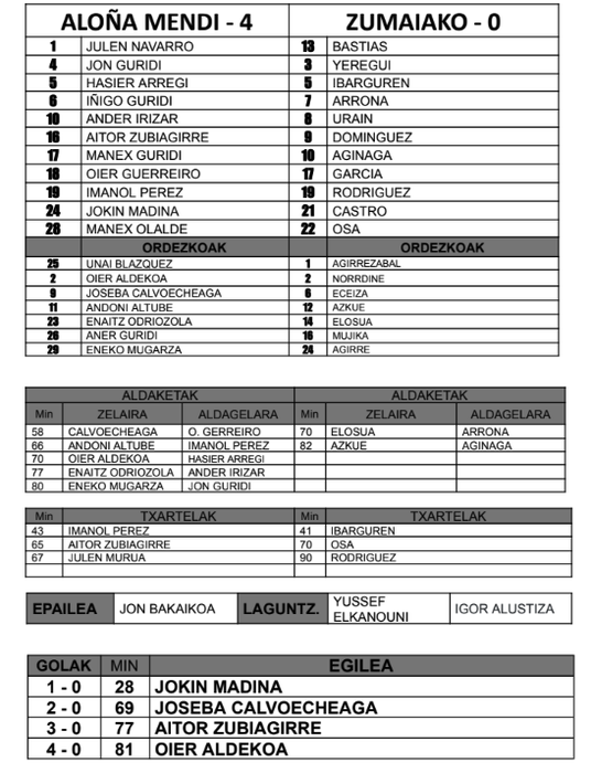 Bigarren zatiak bide beretik jarraitu du, Aloñakoen erabateko nagusitasunarekin. Aukera garbi asko izan badituzte ere, Joseba Calvoecheagaren golak lasaitasuna ekarri du zelaira. Jon Madinaren erdiraketa ederki baliatu du Josebak buruz bigarren gola lortzeko. Hortik aurrera, erabateko nagusitasun hori Aitor Zubiagirrek eta Oier Aldekoak sartutako beste bi gol horietan islatu da.