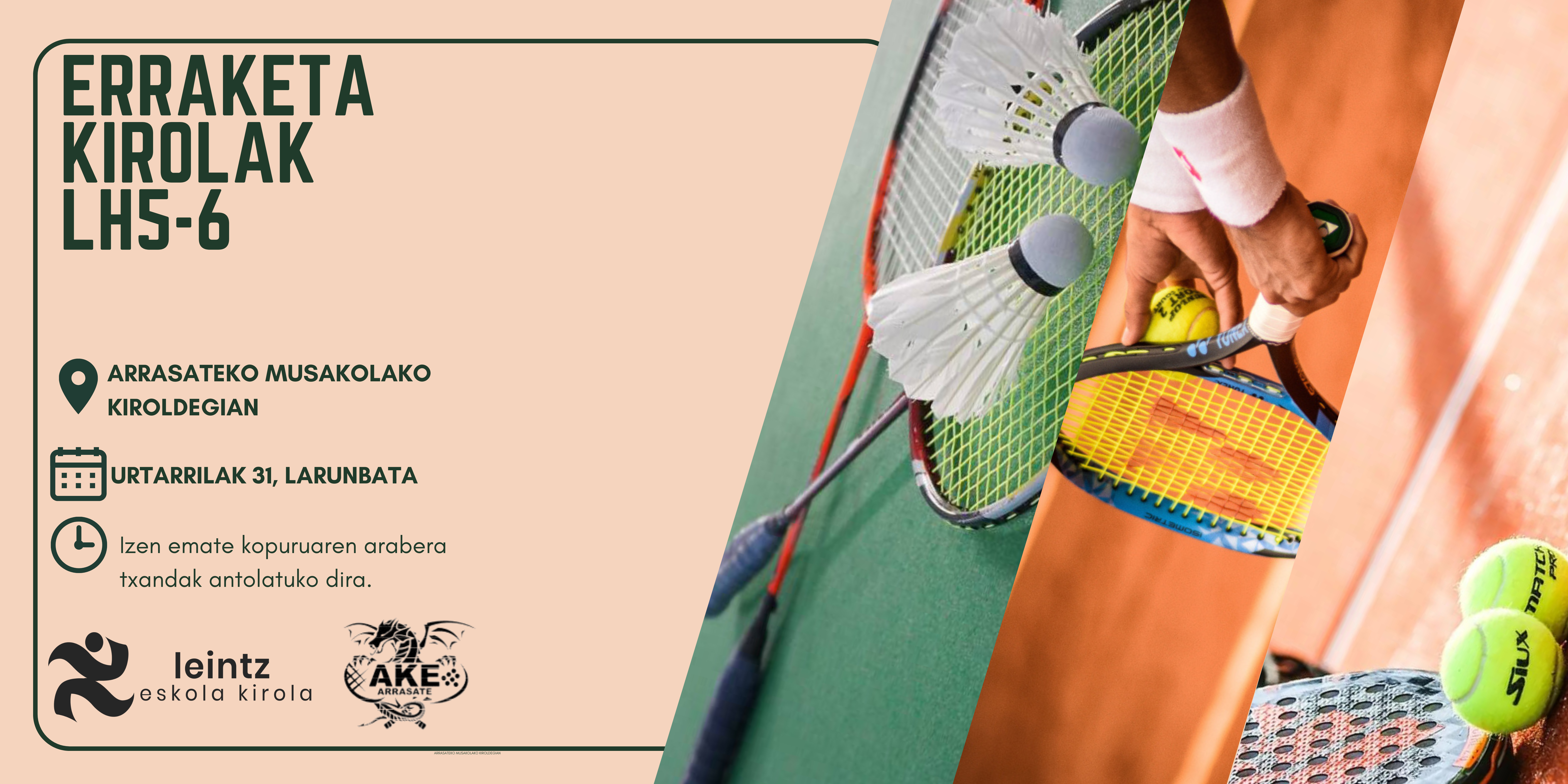 Azken hauek erraketa kirol modalitate ezberdinak probatzeko aukera izango dute, hala nola, tenisa, padela, squash-a eta frontenisa. Hemen ekintzen kartelak: SASKIBALOI TOPAKETA eta ERRAKETA KIROLAK.