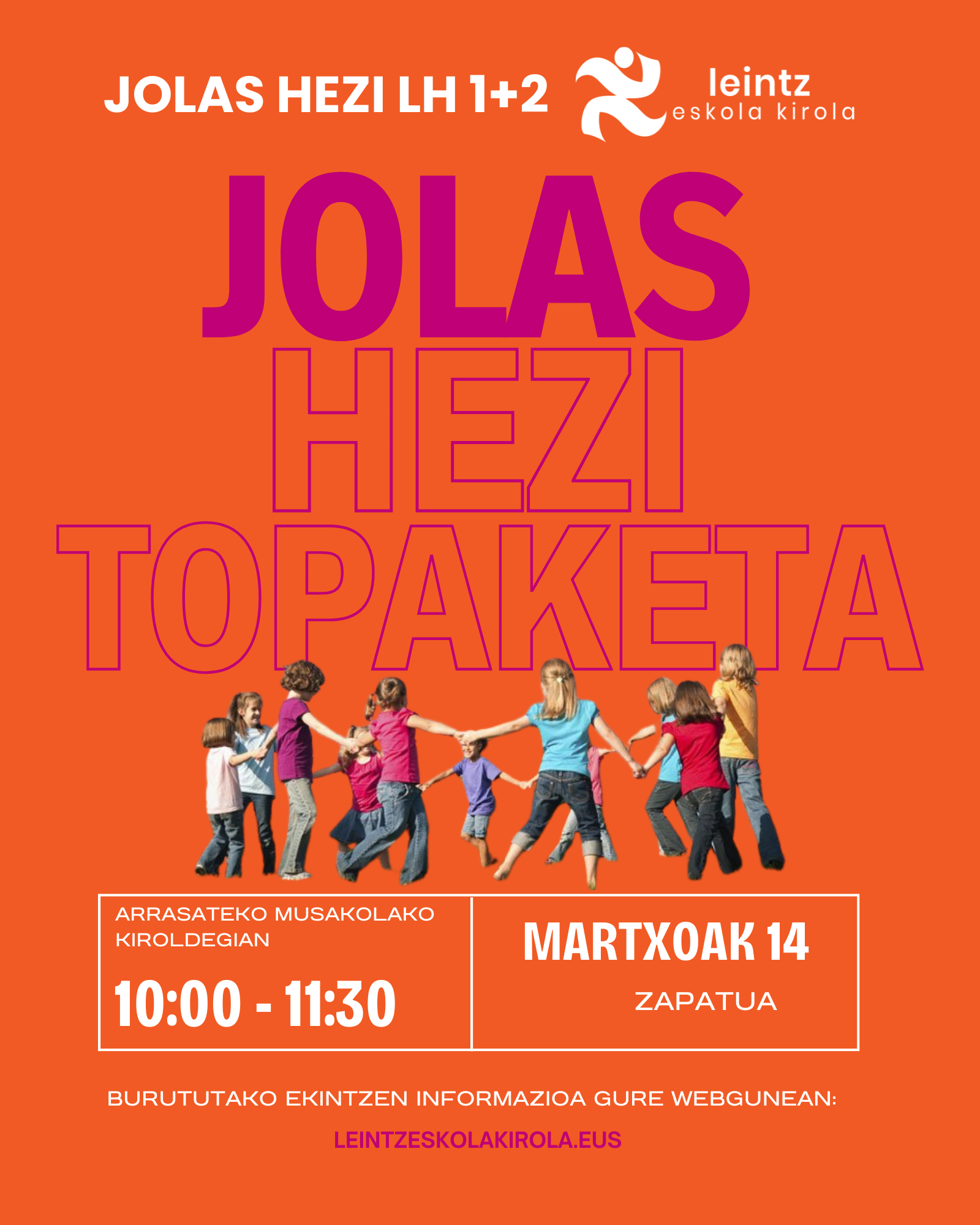 Alde batetik, LH 1-2. mailako ikasleek JOLASHEZI-ko topaketa izango dute Arrasateko Musakolako kiroldegian. Bestetik, LH 3-6. mailako ikasleak errugbia gehiago ezagutzeko aukera izango dute mojategiko errugbi zelaian. Hemen dituzue ekintzen kartelak: JOLASHEZI eta ERRUGBIA.