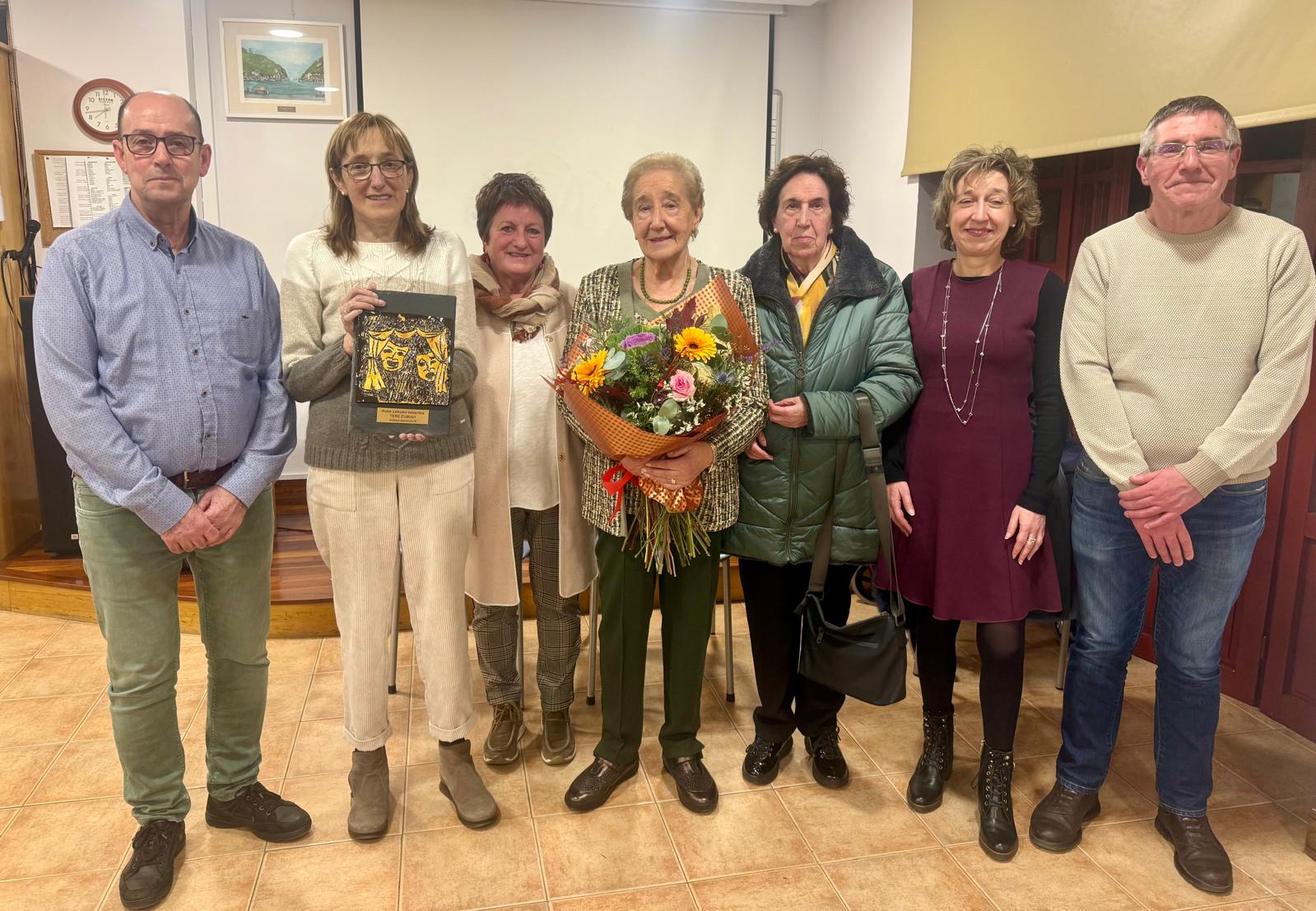 Tere Zubia Uriartek jaso du Pake Leku elkarteak bazkide bati egindako laugarren aitortza saria. 91 urte ditu –hiru alaba, hiru biloba eta birbiloba bat– eta jarraitzen du Ikusi Makusi antzerki taldean parte hartzen, orratz lanen ikastaroetara joaten eta pinturan –50 urtetan egin zuen lana kale Zaharreko Uriarte janari dendan–. Adina ez dela gauzak egiteko muga adierazi du Zubiak sarri eta hain zuzen ere horregatik eman diote aurtengo aitortza saria berari. "Urteak betetzea ez da oztopo gauzak egiteko, ikasten jarraitzeko eta ametsak betetzeko aukera baizik, eta Tere horren adibidea da", zioen Pake Lekuko presidenteak, Migel Angel Kortabarriak, atzo Pake Leku bertan egindako ekitaldian. Etxekoak ondoan zituela jaso zituen lore-sorta eta plaka Zubiak, "pozik".