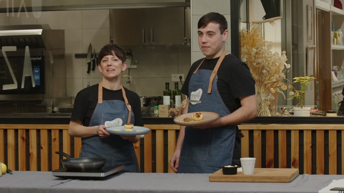 Gazta-krema eta arrautzak osagai nagusi hartuta gazta tarta prestatu dute Basque Culinary Centerreko ikasle Markel Arana arrasatearrak eta Anne Otegi sukaldariak, Ezkaratzean saioko sukaldean.