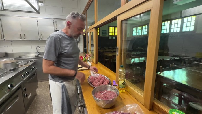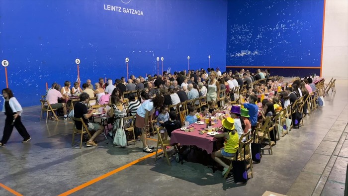 Entsalada eta parrilan egindako haragia izan zuten menu mahaiaren bueltan bildu ziren lagunek. Ohi bezala, Sorginak taldeko emakumeek prestatu zuten lehen platera eta haragia, berriz, erretiratuek egin zuten bertan, pilotaleku kanpoan.